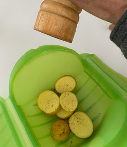 Decía que hoy íbamos a otra cosa, relacionada también con las patatas, pero otra cosa. La vaporera de silicona para microondas es perfecta para asar patatas en tiempos cortos, y fabricar así de manera fácil una guarnición saludable para todo tipo de platos.